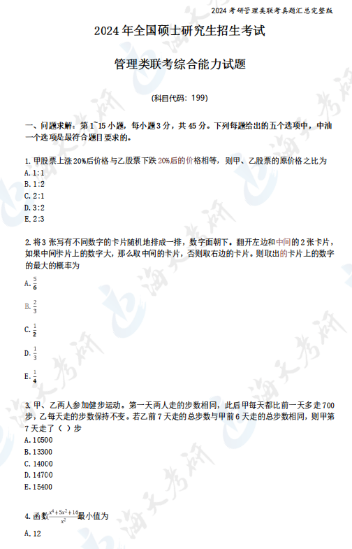 2024全国研究生初试已经全部结束,2024管理类综合能力大家考的怎么样呢?知道大家都在关注2024考研真题及答案解析,海天考研网为各位考生带来2024管综199考研真题完整版,包括管综199问题求解、条件充分性判断、逻辑推理、论证有效性分析和论说文写作,助力各位学子考研初试后核对答案提前估分,2025考研生也可以提前了解一下。